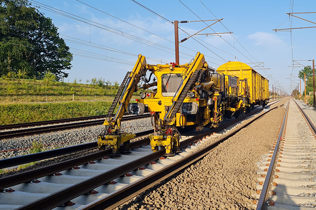 Sporombygningstoget vender tilbage til jernbanen mellem Roskilde og Ringsted. Foto: Banedanmark.